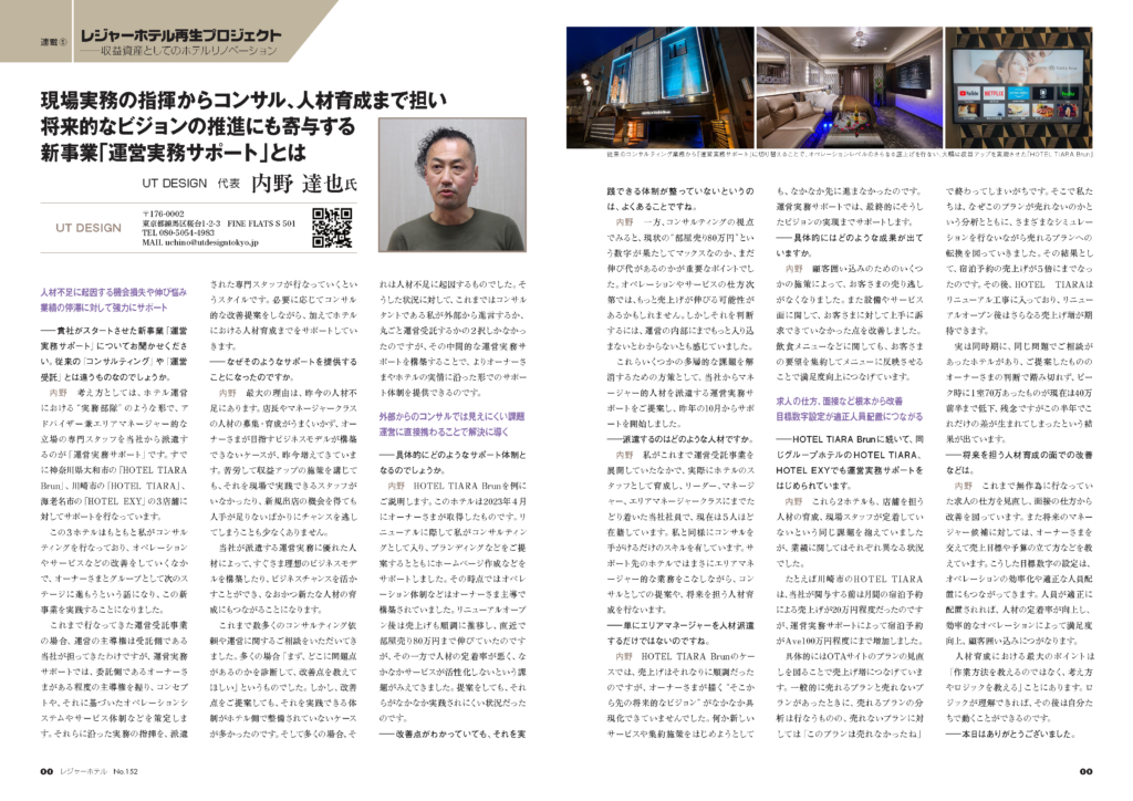 改装からのブランディングだけではなく、中長期も踏まえた運営オペレーション・アドバイジングを行っております。全てにおいての運営代行、マネージャー派遣、予約管理代行、などお客様のニーズに合わせ、運営サービスを承ります。プラン構築からのレベニューコントロール・データ分析からの売り上げ戦略、人件費削減管理等も行っております。